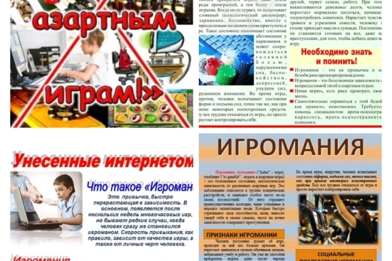 Шукина Н.В., директордың тәрбие ісі жөніндегі орынбасары, лудоманияның алдын алу мақсатында жоғары сынып оқушылары арасында "Ойынға салауатты көзқарас"әңгіме жүргізіп, сауалнама алды, коворкинг орталығында осы тақырып бойынша ақпараты бар буклет орналасты