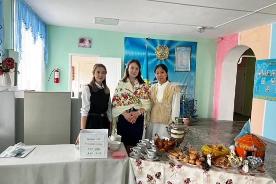 Тіл мамандары таңертең мектеп оқушылары мен әріптестерін жылы лебізбен қарсы алып, дастархан жайып, қызықты қазақ тілі, орыс тілі, ағылшын тілі ойынын өткізді